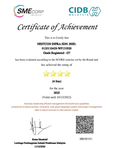 NESTCON INFRA SDN BHD was awarded the prestigious CIDB 4 Star SCORE Award in year 2020.